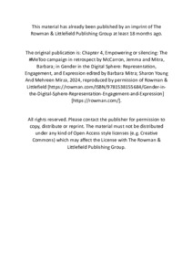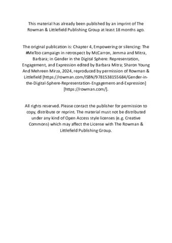 | Additional Information: | This chapter is listed on the publisher webpage as 'Chapter 4: Empowering or silencing: The #MeToo campaign in retrospect', but in print is 'Chapter 4: Public Sphere, Social Media and the #MeToo Campaign'. |