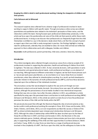 British J Special Edu - 2023 - Solvason - Keeping the child in mind in multi‐professional working Valuing the viewpoints.pdf - Published Version Available under License Creative Commons Attribution Non-commercial No Derivatives. Download (187kB) | Preview |