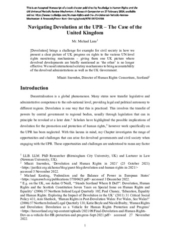 Lane, Michael (2024) Navigating Devolution at the UPR: The Case of the United Kingdom. In: Human Rights and the UN Universal Periodic Review Mechanism: A Research Companion. Routledge, Abingdon, pp. 277-299. ISBN 9781032524184 or 9781003415992