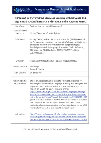 Hickey, Tobias, Grobler, Petrus and Stanic, M. (2024) Foreword. In: Performative Language Learning with Refugees and Migrants: Embodied Research and Practice in the Sorgente Project. Routledge Research in Language Education . Taylor & Francis, Abingdon, xiv. ISBN Hardback: 9780367553357 • eBook: 9781003093077
