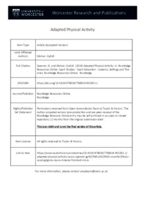 The term adapted physical activity (APA) refers to a field of research, theory and practice associated with various forms of movement and physical activity most often related to disability and impairment. In this entry, we explore the field of APA. In doing so, we also examine a select number of key topics, some of which have been part of APA since even before its inception, and others, while not new, are gaining momentum and providing important opportunities to rethink and reflect on the direction(s) the field has taken and may take in the future. Specifically, we discuss: 1. Understandings of APA, 2. Development of Adapted Physical Activity and Disability, 3. The Meaning of Adapted, 4. Service delivery, and 5. Theoretical Approaches and Research Paradigms.