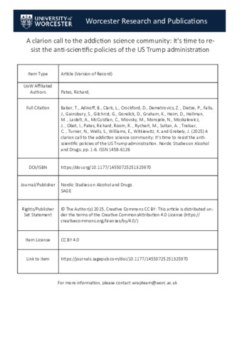 Babor, T. F., Adinoff, B., Clark, L., Crockford, D., Demetrovics, Z., Dietze, P., Fallu, J., Gainsbury, S., Gilchrist, G., Gorelick, D. A., Graham, K., Grebely, J., Heim, D., Hellman, M., Laslett, A., McCuistian, C., Miovsky, M., Morojele, N. K., Moskalewicz, J., Obot, I. S., Pates, R., Room, R., Rychert, M., Sultan, A., Treloar, C., Turner, N. E., Wells, S., Williams, E. C., & Witkiewitz, K. (2025). A clarion call to the addiction science community: It's time to resist the anti-scientific policies of the US Trump administration. Journal of Behavioral Addictions, 14(2), 567-570. https://doi.org/10.1556/2006.2025.00033