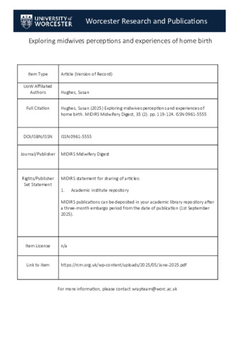 Hughes, Susan (2025) Exploring midwives perceptions and experiences of home birth. MIDIRS Midwifery Digest, 35 (2). pp. 119-124. ISSN 0961-5555