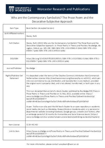 Stacey, Ruth (2022) Who are the Contemporary Symbolists? The Prose Poem and the Decorative-Subjective Approach. In: Prose Poetry in Theory and Practice. Routledge, Abingdon, Oxford, pp. 185-198. ISBN ISBN: 978-1-032-05861-0 (hbk) ISBN: 978-1-032-05859-7 (pbk) ISBN: 978-1-003-19953-3 (ebk)