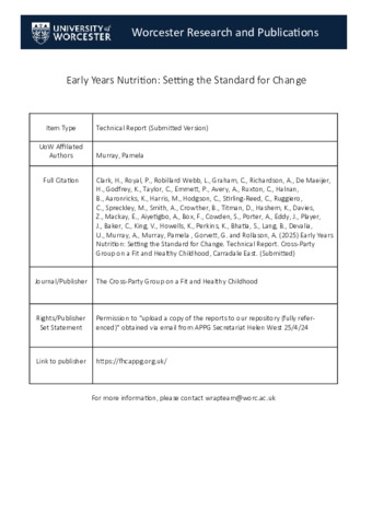 Clark, H., Royal, P., Robillard Webb, L., Graham, C., Richardson, A., De Maeijer, H., Godfrey, K., Taylor, C., Emmett, P., Avery, A., Ruxton, C., Halnan, B., Aaronricks, K., Harris, M., Hodgson, C., Stirling-Reed, C., Ruggiero, C., Spreckley, M., Smith, A., Crowther, B., Titman, D., Hashem, K., Davies, Z., Mackay, E., Aiyetigbo, A., Box, F., Cowden, S., Porter, A., Eddy, J., Player, J., Baker, C., King, V., Howells, K., Perkins, K., Bhatia, S., Lang, B., Devalia, U., Murray, A., Murray, Pamela ORCID logoORCID: https://orcid.org/0000-0001-8009-6900, Gorvett, G. and Rollason, A. (2025) Early Years Nutrition: Setting the Standard for Change. Technical Report. Cross-Party Group on a Fit and Healthy Childhood, Carradale East.