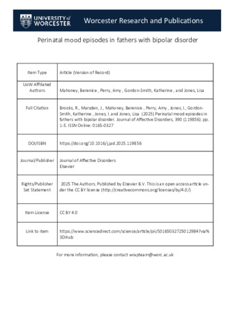 Brooks, R., Marsden, J., Mahoney, Berenice ORCID logoORCID: https://orcid.org/0000-0002-7414-8185, Perry, Amy ORCID logoORCID: https://orcid.org/0000-0002-9381-6636, Jones, I., Gordon-Smith, Katherine ORCID logoORCID: https://orcid.org/0000-0003-4083-1143, Jones, I. and Jones, Lisa ORCID logoORCID: https://orcid.org/0000-0002-5122-8334 (2025) Perinatal mood episodes in fathers with bipolar disorder. Journal of Affective Disorders, 390 (119856). pp. 1-5. ISSN Online: 0165-0327