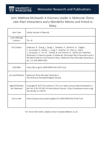 Anderson, R., Chang, J., Dangl, J., Dinkeloo, K., Donofrio, N. ORCID logoORCID: https://orcid.org/0000-0002-9440-6081, Eulgem, T., Grünwald, N., Herlihy, J., Long, T., Mukhtar, M., Pilot, G., Sherif, S., Sonawala, U., Tör, M. ORCID logoORCID: https://orcid.org/0000-0002-4416-5048, Winkel, B. and Vinatzer, B. ORCID logoORCID: https://orcid.org/0000-0003-4612-225X (2025) John Matthew McDowell: A Visionary Leader in Molecular Oomycete-Plant Interactions and a Wonderful Mentor and Friend to Many. Molecular Plant-Microbe Interactions. pp. 1-6. ISSN 0894-0282