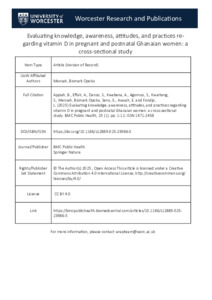 Appiah, B., Effah, A., Danso, S., Kwabena, A., Agomuo, S., Kwarteng, S., Opoku Mensah, Bismark, Senu, E., Awuah, E. and Fondjo, L. (2025) Evaluating knowledge, awareness, attitudes, and practices regarding vitamin D in pregnant and postnatal Ghanaian women: a cross-sectional study. BMC Public Health, 25 (1). pp. 1-12. ISSN 1471-2458