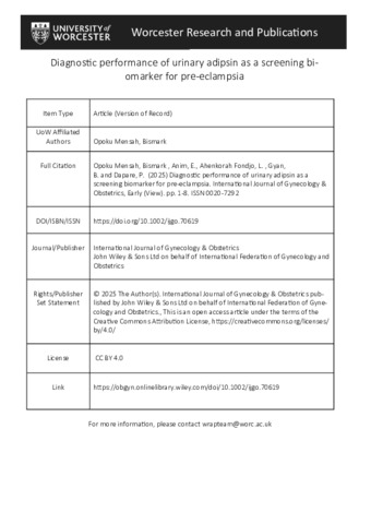 | Uncontrolled Discrete Keywords: | blood pressure, diagnostic performance, predictive value, pre-eclampsia, sensitivity, specificity, urinary adipsin, urine protein |