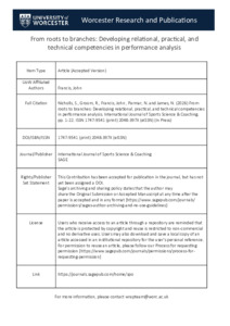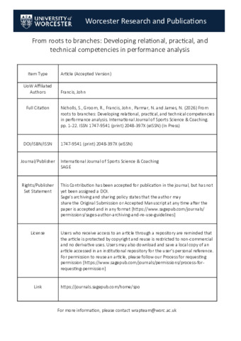 Nicholls, S., Groom, R., Francis, John ORCID logoORCID: https://orcid.org/0000-0001-7457-5665, Parmar, N. and James, N. (2026) From roots to branches: Developing relational, practical, and technical competencies in performance analysis. International Journal of Sports Science & Coaching. pp. 1-22. ISSN 1747-9541 (print) 2048-397X (eISSN) (In Press)