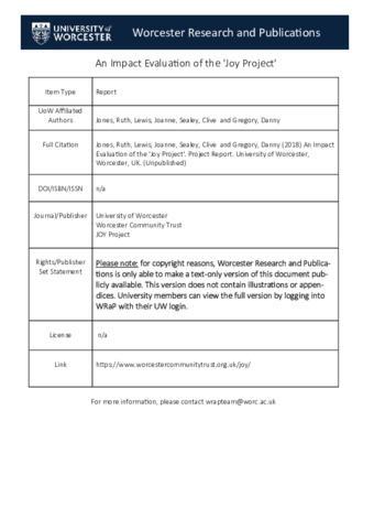 This report gives an overview of research undertaken to evaluate the impact of the JOY Project which is based in the City of Worcester, England. The project is "a woman only community project which provides support to enable women to gain a variety of skills, enhance their confidence and empower them to make their own informed decisions" (WCT, 2018a).